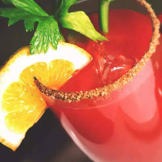 En un vaso de mezcla, machaque las salsas, las especias y la albahaca. Agregue todos los ingredientes restantes y agite de un lado a otro con hielo en una coctelera grande. Vierta sobre hielo en un vaso con el borde recubierto con tajín.