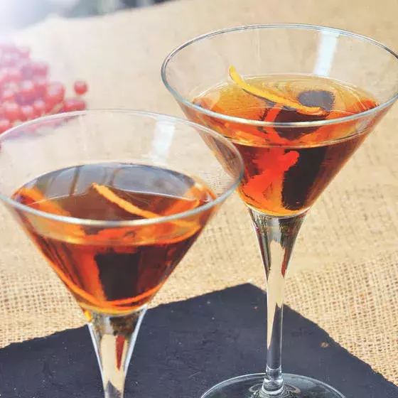 Combine todos los ingredientes con hielo en un vaso de mezcla. Cuele sobre un vaso de cóctel frío. Adorne con una cereza y/o cáscara de limón.