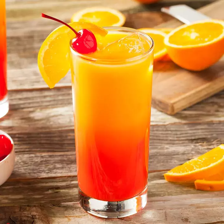Prepare en orden sobre hielo en un vaso largo alto. Estratifique la granadina. Adorne la bebida con una rodaja de naranja o una cereza.