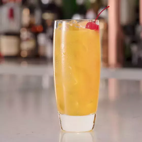 Prepárelo sobre hielo en un vaso largo alto. Adorne con una cereza.